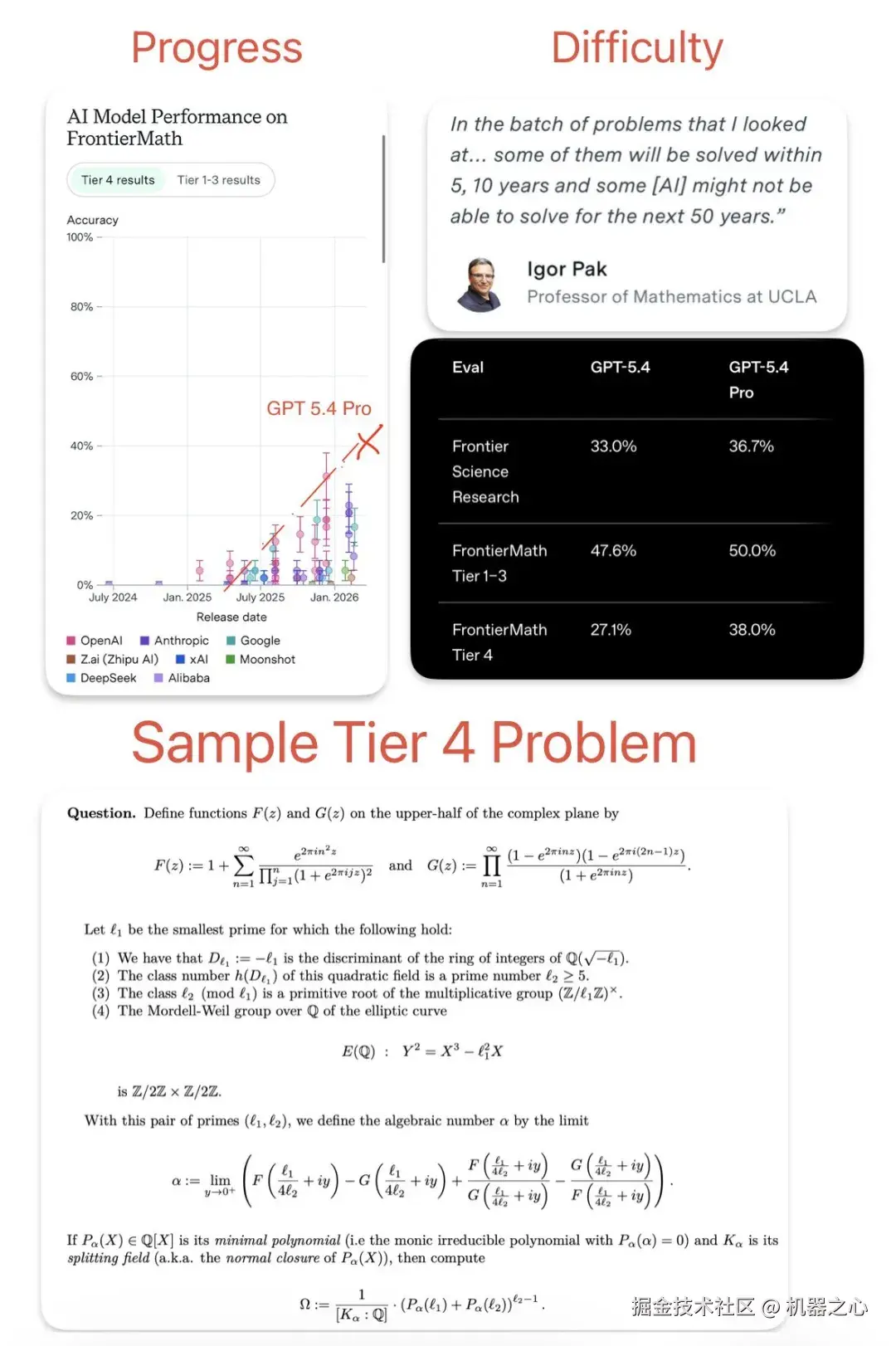 在评测基准上,GPT 5.4 Pro 以 38% 的成绩轻松击败了最难的数学基准测试 FrontierMath Tier 4------ 该基准包含 50 道研究级别的数学题,数学家可能需要几周时间才能解决。仅仅在一年前,最佳成绩为 2% (o3) ,目前最佳的开源模型分数为 4.2% (Kimi K2.5)。