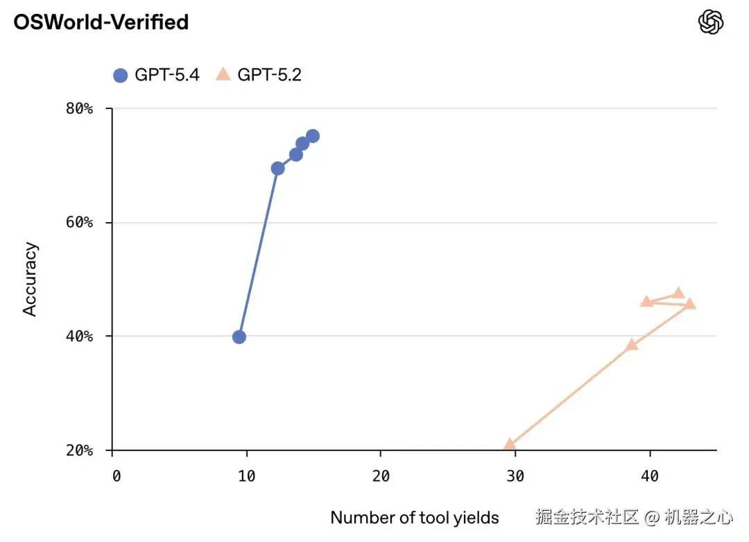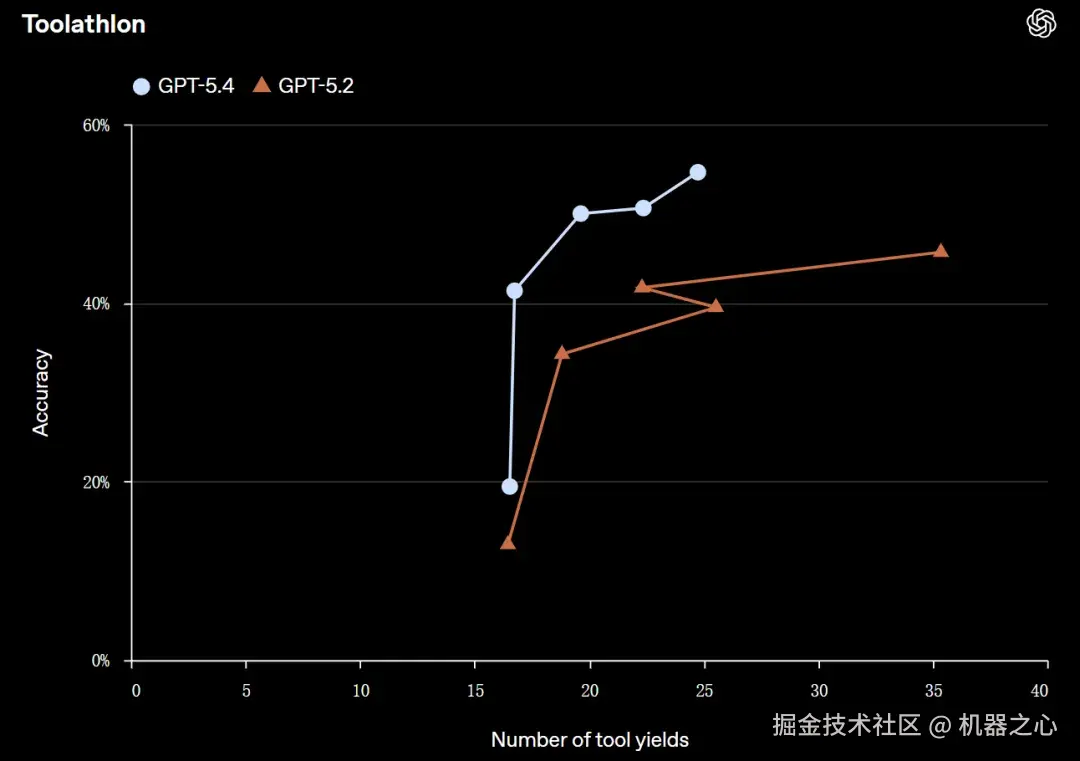 GPT-5.4 改进了工具调用,使其在推理过程中(尤其是在 API 调用中)能够更准确、更高效地决定何时以及如何使用工具。与 GPT-5.2 相比,它在 Toolathlon 测试中以更少的回合数实现了更高的准确率。