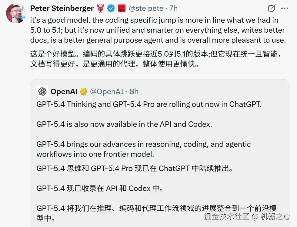 有意思的是,这次 GPT-5.4 的上新,恰好发生在知名开发者 Peter Steinberger 加入 OpenAI 不久之后。这很难不让人猜测,Peter 的加入会对 OpenAI 在计算机使用和开发者工具方向上的布局产生多少影响。Peter 本人也进行了宣传: