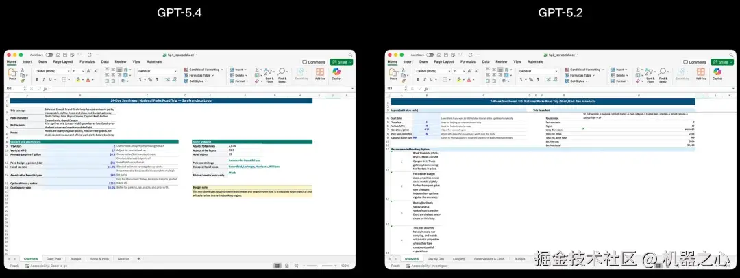 OpenAI 重点提升了 GPT-5.4 创建和编辑电子表格、演示文稿和文档的能力。在一系列演示文稿评估提示中,由于 GPT-5.4 的演示文稿具有更强的美观性、更丰富的视觉效果以及更高效的图像生成功能,获得了人类评分者的青睐。