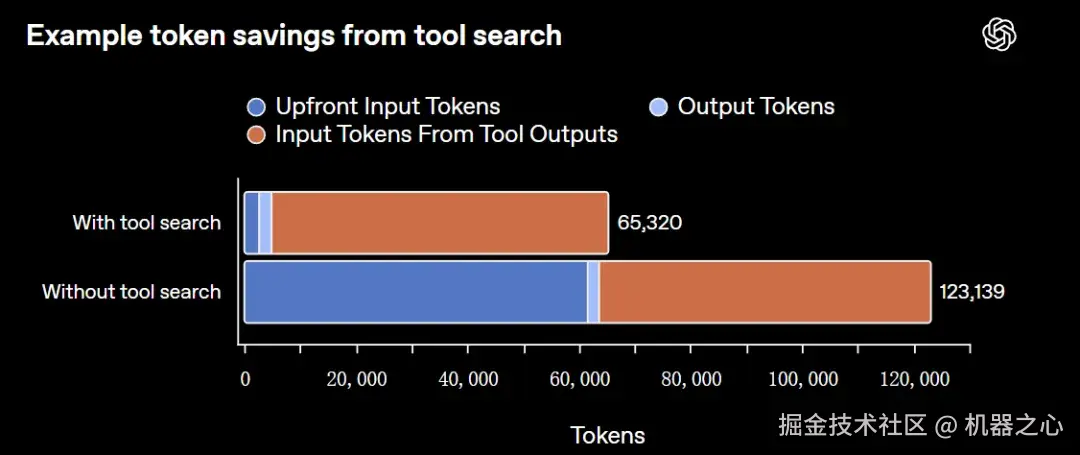 OpenAI 评估了 Scale 的 MCP Atlas 中的 250 项任务,工具搜索配置在保持相同准确率的同时,将总 token 使用量减少了 47%。