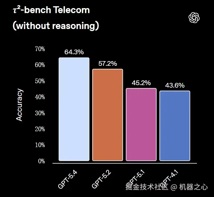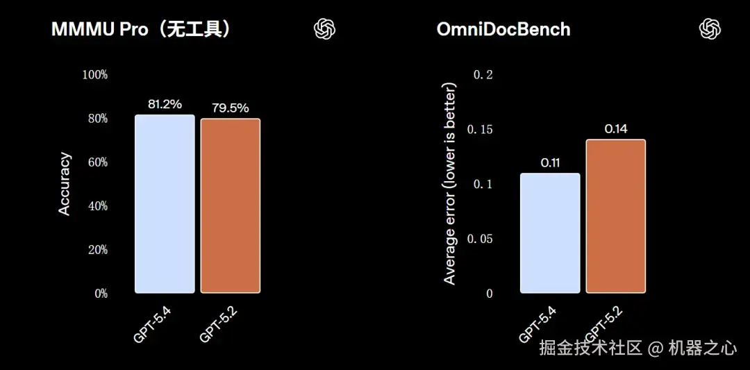 GPT-5.4 计算机性能的提升得益于其增强的通用视觉感知能力。在 MMMU-Pro 测试中,GPT-5.4 在不使用任何工具的情况下取得了 81.2% 的成功率,优于 GPT-5.2 的 79.5%。