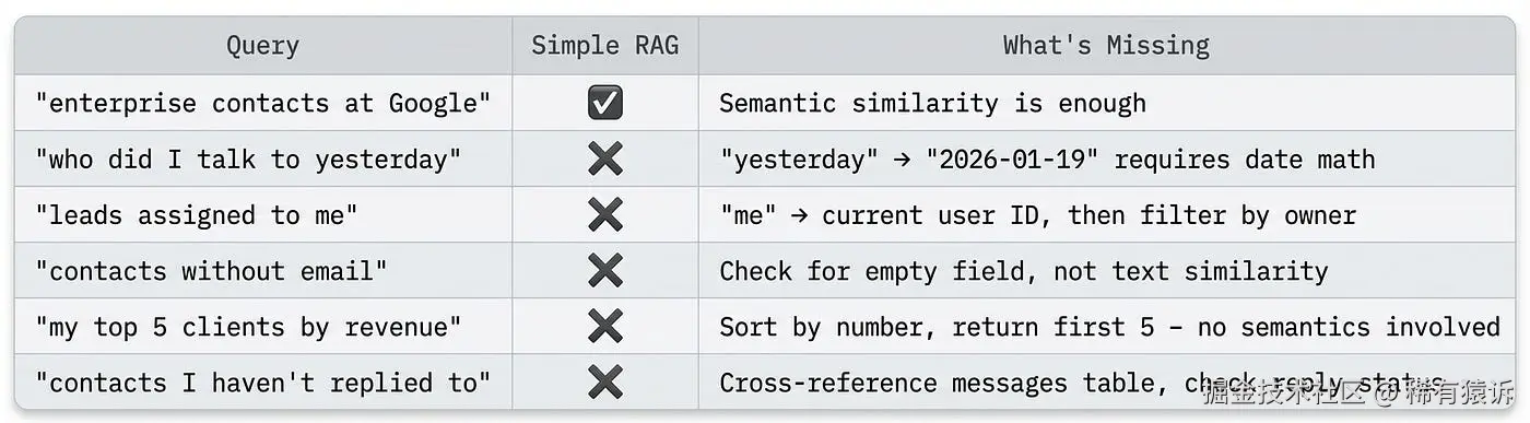 "昨天"一词会生成一个表示"昨天"概念的嵌入向量,类似于"最近"、"过去"、"之前"。你的联系人记录包含日期:"2026-01-19"、"1月19日"。这些日期在语义上并不相似------不存在一个向量空间,使得"昨天"和"2026-01-19"指向同一方向。