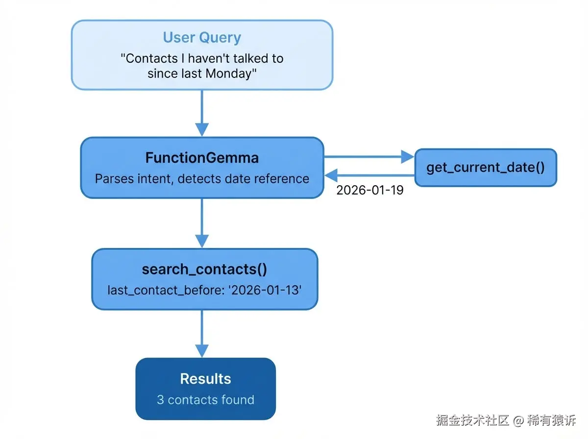 我们不会将用户的查询直接传递给向量搜索,而是先让 LLM 解析它。为了使这种智能体行为在设备上生效,你需要一个能够理解函数调用(而不仅仅是聊天)的模型。谷歌专门为此发布了 FunctionGemma:一个拥有 2.7 亿个参数的模型,经过优化,可以解析用户意图并使用正确的参数调用函数。我在使用 FunctionGemma 进行设备端函数调用中详细介绍了如何使用它。