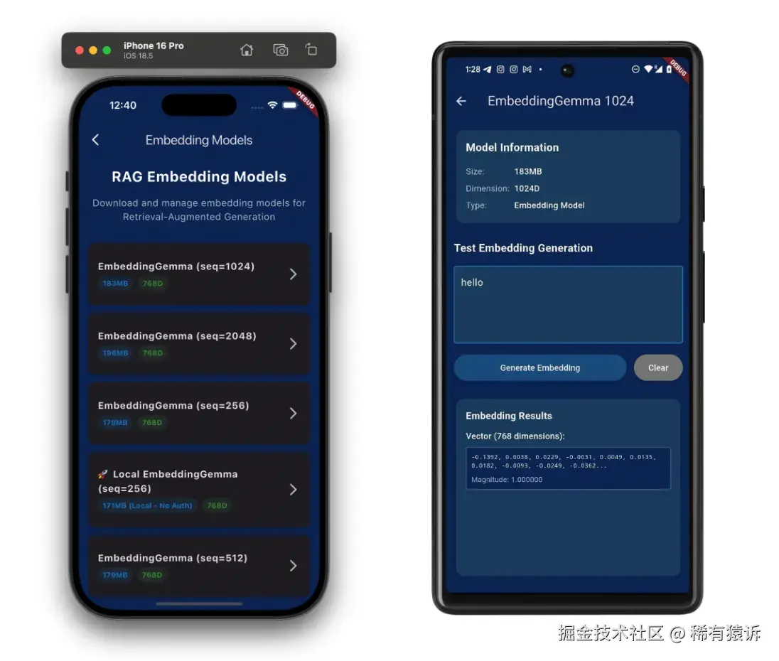 2025 年 9 月,谷歌发布了EmbeddingGemma------一个基于 Gemma 3 的 3.08 亿参数嵌入模型,专为设备端使用而设计。你可以在 HuggingFace 上找到该模型。我一看到公告就知道 Flutter Gemma 需要嵌入支持------这意味着要为三个平台实现嵌入生成(当时桌面平台还不支持)。