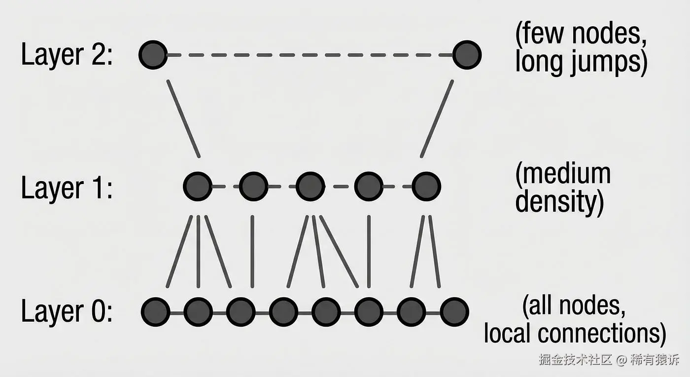 HNSW(分层可导航小世界) 通过巧妙的多层图结构解决了这个问题。可以把它想象成地铁线路图:快线连接主要枢纽(顶层),而慢线连接每个站点(底层)。搜索从顶层开始,先进行大范围的跳跃以接近目标,然后再向下移动到局部层以提高精度。