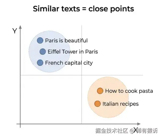 传统的关键词搜索存在缺陷。例如,搜索"大公司"时,你找不到"企业客户"------即使它们的意思相同。语义搜索通过理解文本含义而非仅仅匹配单词来解决这个问题。其核心思想是:将文本转换为能够捕捉其含义的数字(向量)。含义相似 → 向量相似。这样,查找相关记录就变成了一个数学问题------找到与查询最接近的向量。