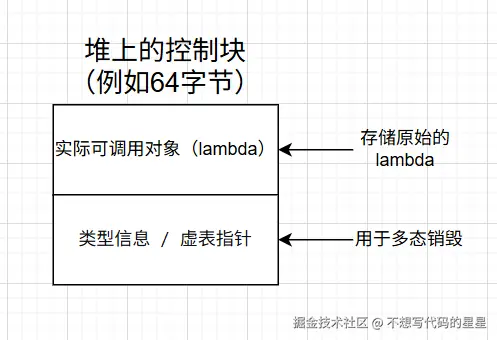 当使用小对象优化时,lambda 直接存放在 _Storage 中,不需要额外堆分配。
