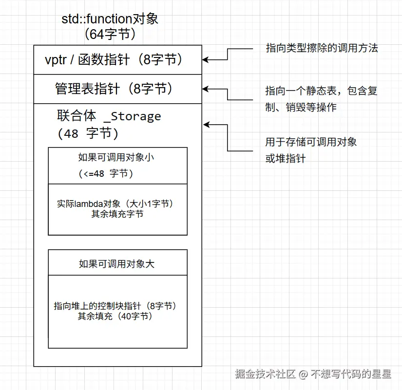 总结:std::function 是类型擦除容器,内部包含一个静态缓冲区(用于小对象优化)和若干管理指针,因此体积较大。
