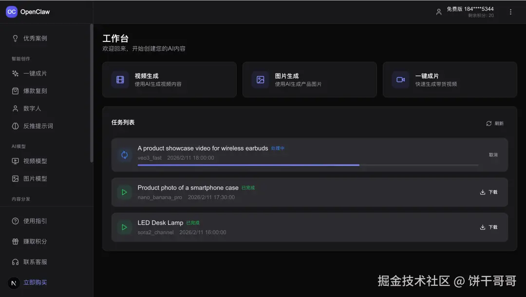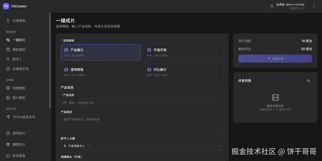 - 积分系统:通了。生成一次扣 20 分,余额不足无法生成。