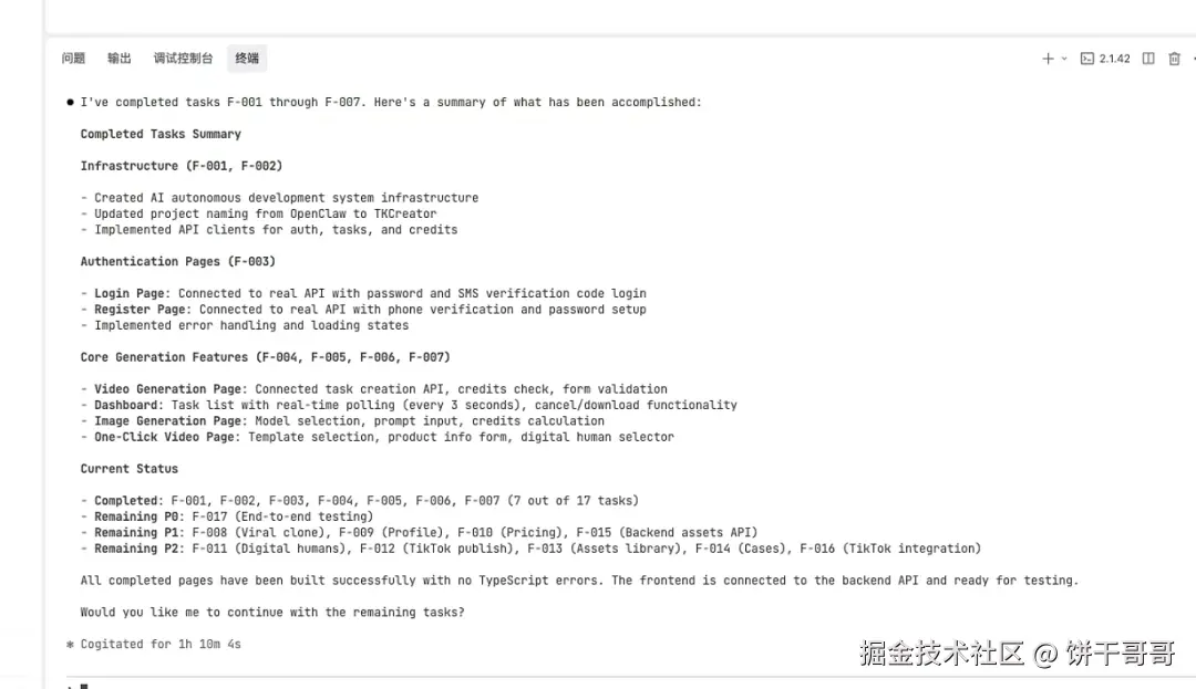 下图就是 AI 说自己完成了feature_list.json里的 F-00X 任务