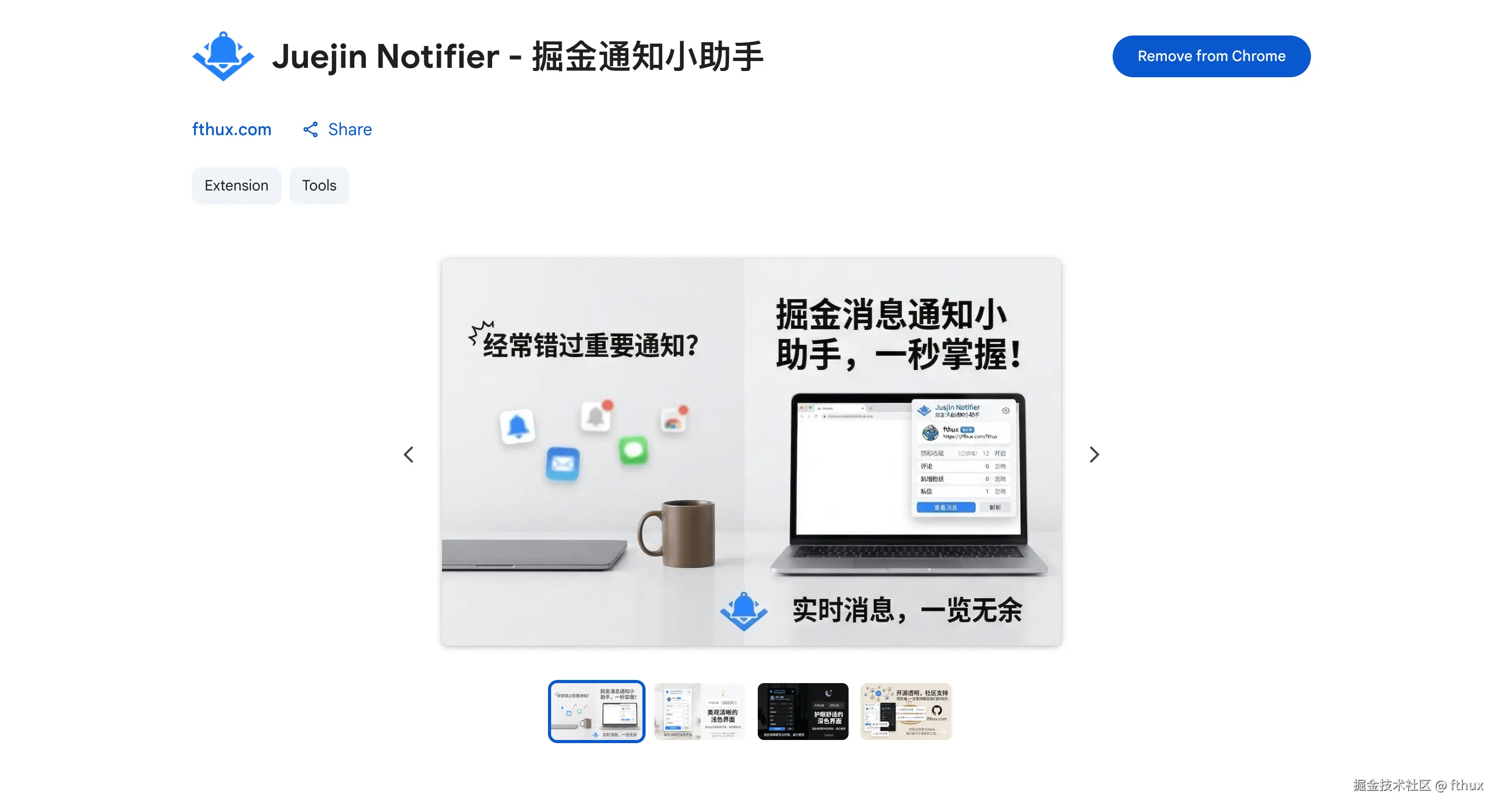 访问 Chrome Web Store 上的 Juejin Notifier ↗ 页面安装。