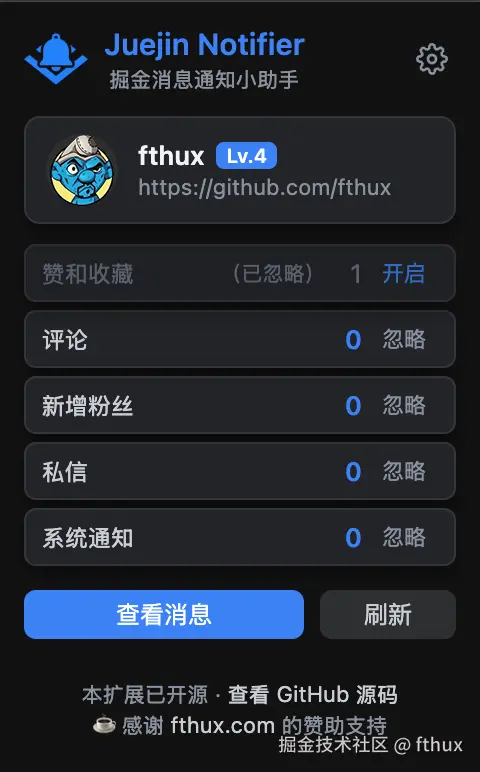 Juejin Notifier 是一款 Chrome 扩展,通过掘金的官方 API 获取消息通知(顺道显示了一下头像和昵称,咱就确认一下是自己的账号就行了,别整了半天是别人的号)。无需频繁的打开掘金 web 站,即可第一(也可能是第二?)时间获取赞和收藏、评论、新增粉丝、私信、系统通知五类消息动态。