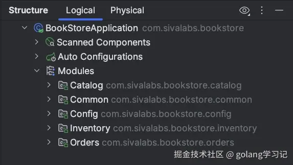 模块就是你应用基础包的直接子包(比如com.example.bookstore.catalog、com.example.bookstore.orders)。Spring Modulith会检查: