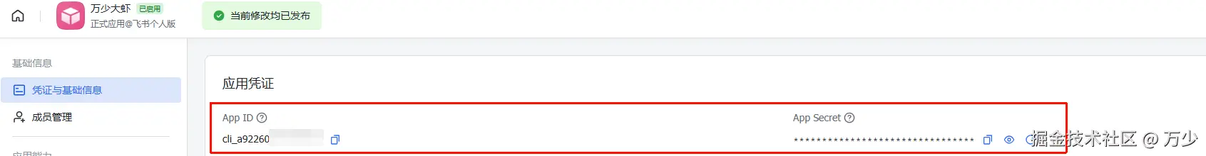 此时复制飞书机器人的的 App ID 和 App Secret