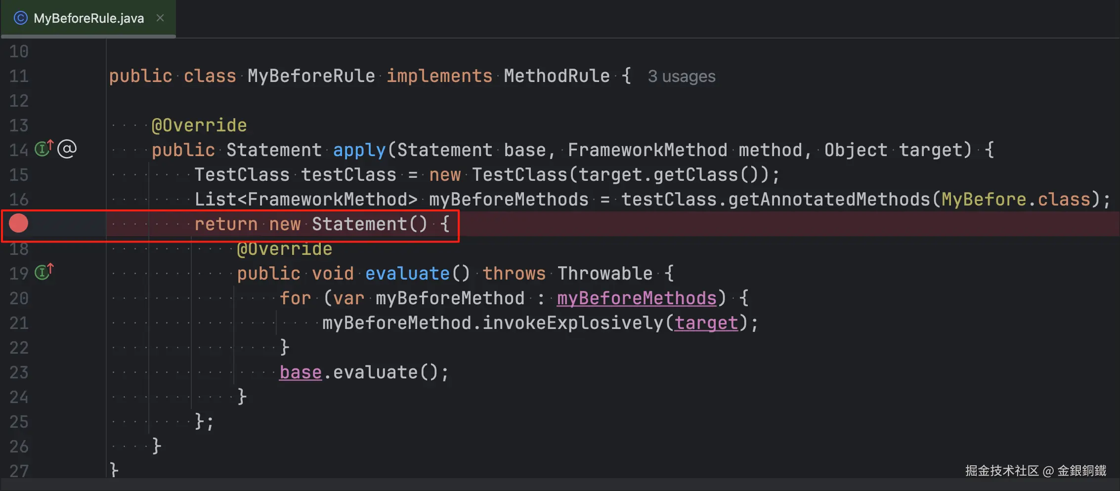 我们在 MyBeforeRule 类打一个断点(断点的位置如下图所示 ⬇️)。为了便于描述,我们把它简称为 断点甲 吧。