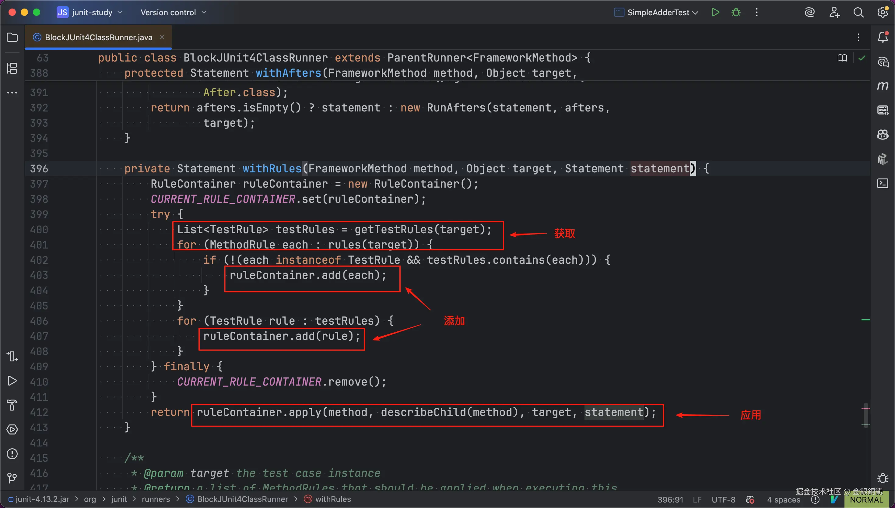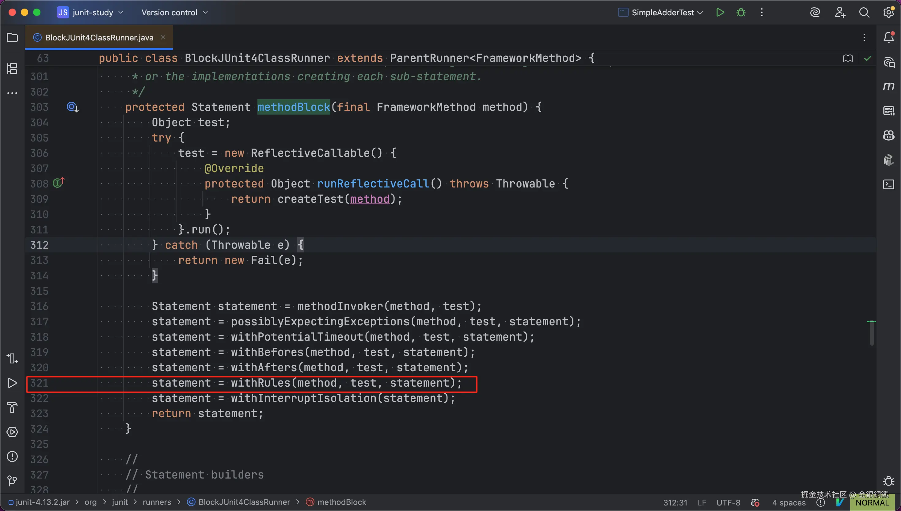 在 org.junit.runners.BlockJUnit4ClassRunner 的 methodBlock(FrameworkMethod) 方法中,可以看到有一行代码会调用 withRules(FrameworkMethod, Object, Statement) 方法(代码的位置如下图所示 ⬇️)