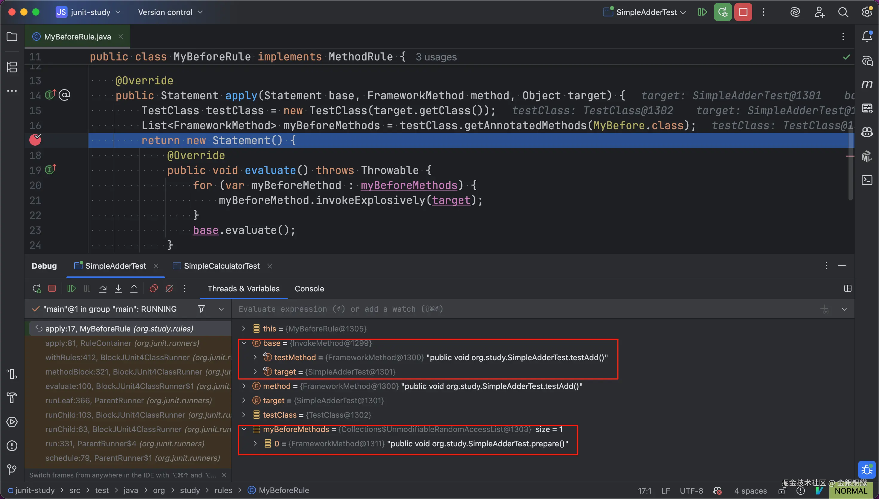 之后 debug SimpleAdderTest 的 main 方法。当程序运行到 断点甲 这里时,可以看到 base 变量以及 myBeforeMethods 变量的内容都符合预期(效果如下图所示 ⬇️)