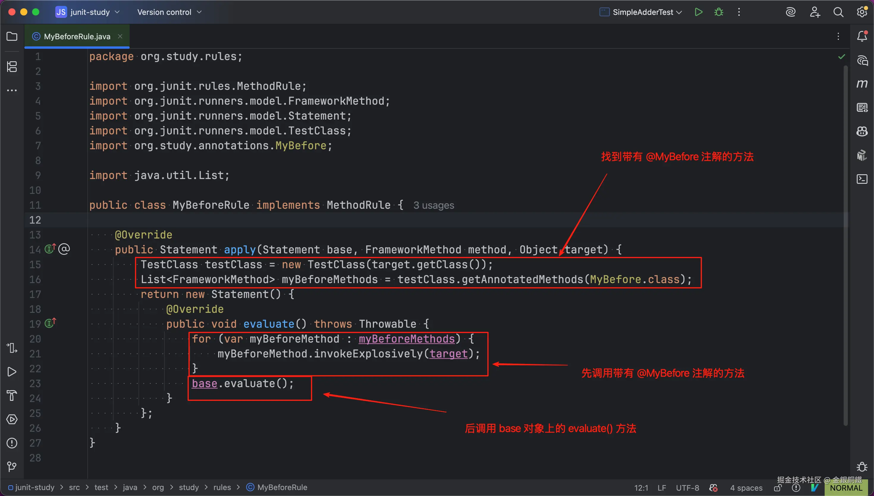 画 "JUnit 4 如何处理 @Before 注解?" 一图所用到的代码