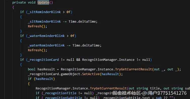 UI 在激活时订阅所有需要监听的事件,在禁用时取消订阅,避免内存泄漏。Refresh 方法会从各个 Manager 读取最新数据并更新对应的 UI 元素,比如会议倒计时文本、饮水进度条、杯数文字等。这种集中刷新的方式比每个事件单独更新更简洁,也更容易维护。