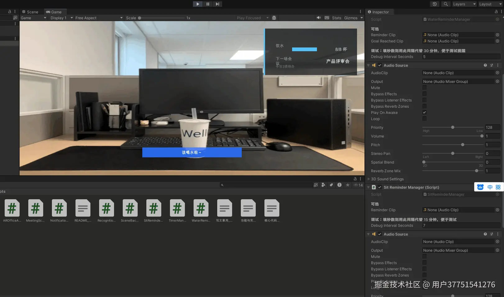 正是出于这个想法,我基于 Rokid 平台,利用 Unity 引擎打造了一款 AR 办公助手。它能在你的视线上方显示会议倒计时、今日待办、饮水久坐提醒、工位/会议室识别结果、番茄钟和下班倒计时,还能像手机弹窗那样展示新消息。所有 UI 都是代码动态生成,没有用任何预制体,方便后续迭代。最关键的是,它完全解耦了业务逻辑和界面,每个功能模块都是独立的 Manager,通过事件驱动 UI 刷新,以后接入真实的日历 API、Rokid 识别回调、语音指令都会非常轻松。