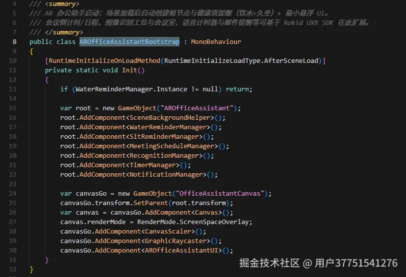 通常 Unity 应用需要一个初始场景来挂载脚本,但为了减少手动配置,我写了一个 AROfficeAssistantBootstrap 类,利用 [RuntimeInitializeOnLoadMethod] 特性,在场景加载完成后自动执行。它会创建一个名为 AROfficeAssistant 的根 GameObject,挂上所有的 Manager 脚本,再创建一个 ScreenSpaceOverlay 的 Canvas,挂上 AROfficeAssistantUI 来管理界面。这样一来,只要把这些脚本放进项目,运行后什么都不用拖,应用就自动启动了。