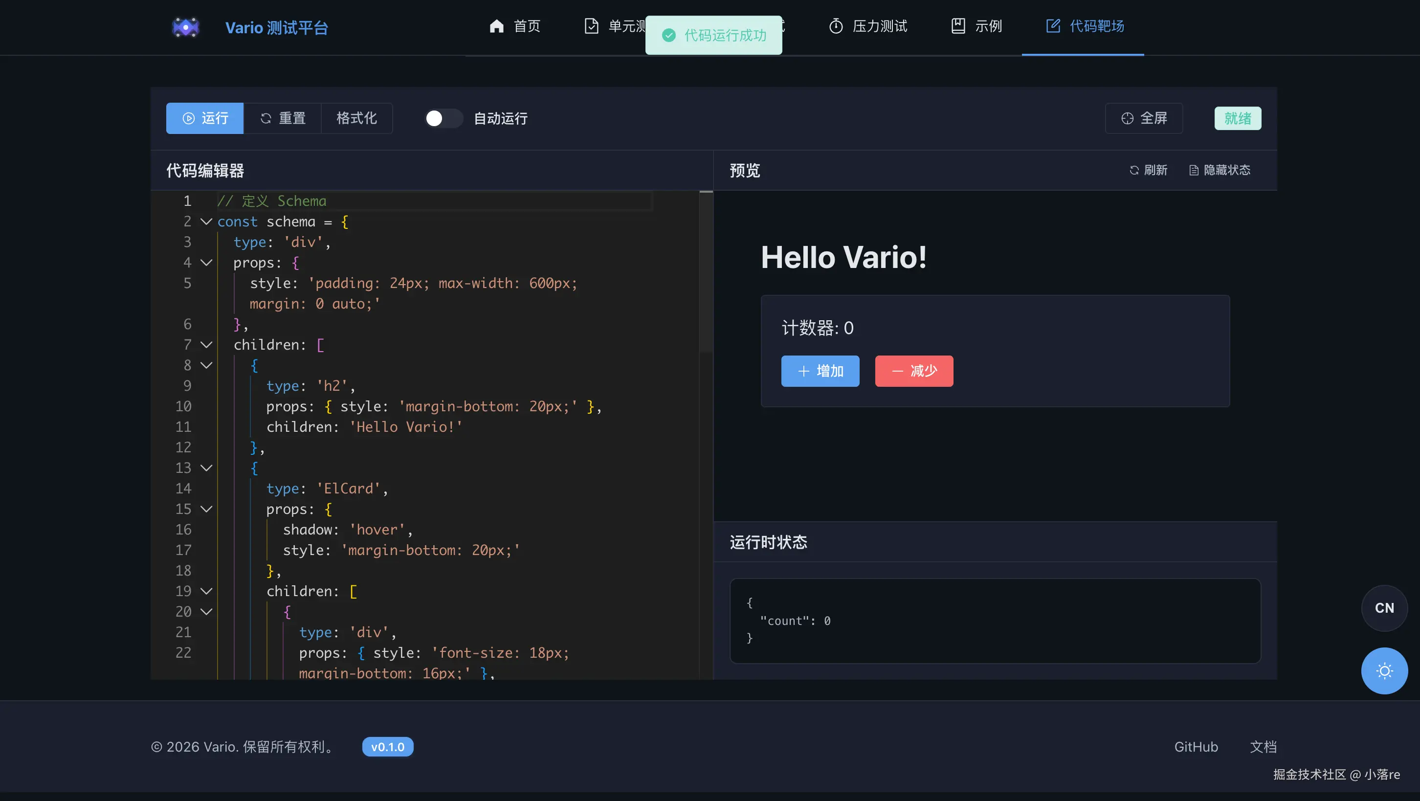 Vario 目前已开源,文档和示例都比较完整。但一个人做的项目终归有视野和精力的局限。如果你对 Schema 驱动 UI、AI + 低代码、渲染引擎设计这些方向感兴趣,非常欢迎参与: