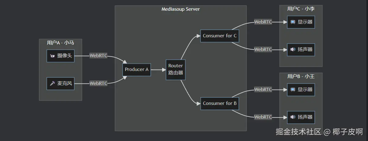 最简单的方案是"点对点"连接,但10个人开会就需要45个连接!更好的方案是 SFU(选择性转发单元) :大家把视频发给服务器,服务器转发给其他人。Mediasoup 就是这样的服务器。本文讲基于Mediasoup讲述这背后服务之间是如何进行配合的。