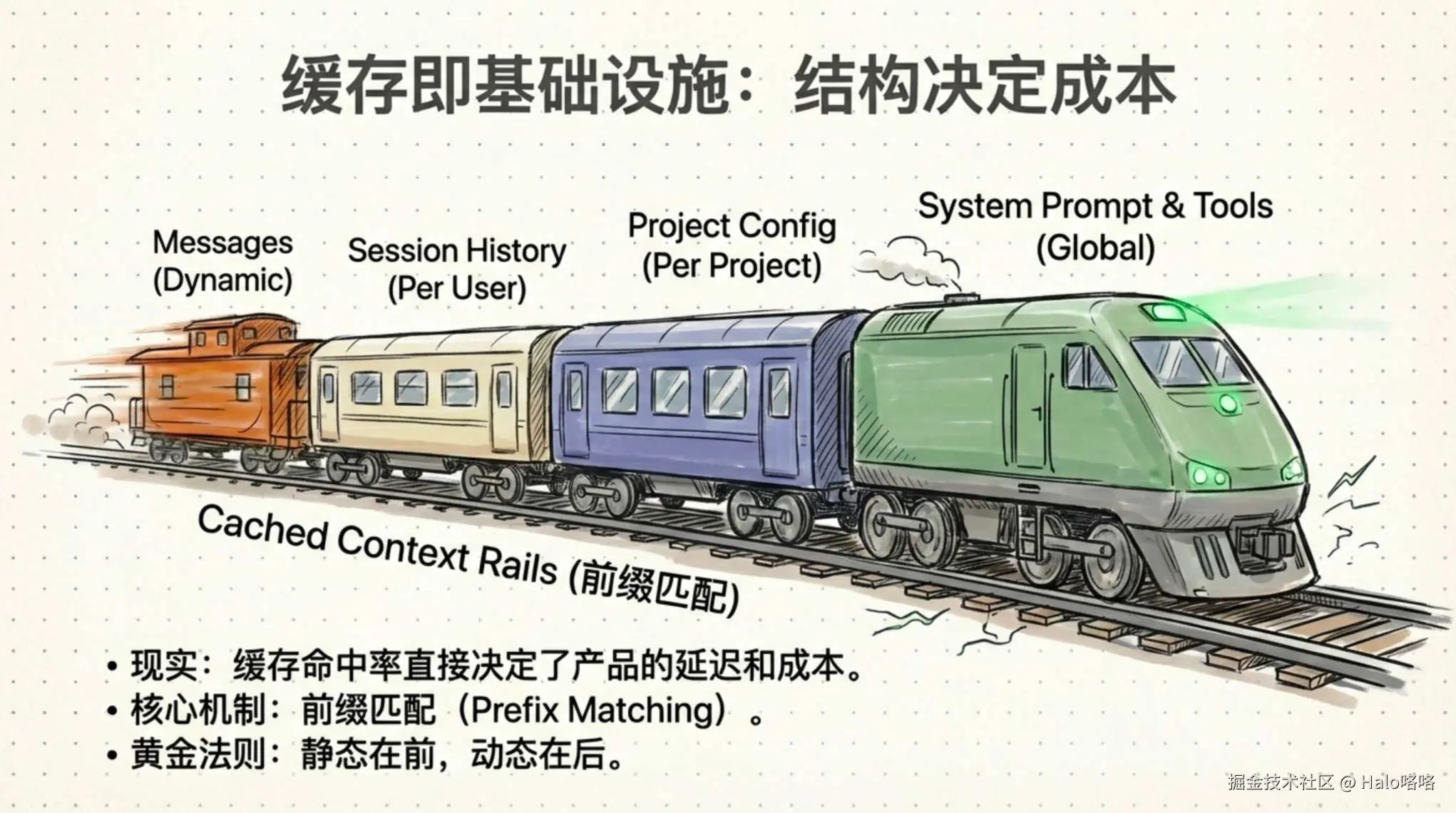 缓存的核心机制是前缀匹配。不是模糊匹配,不是语义匹配,就是从第一个字符开始逐字比对。这意味着请求内容的排列顺序变得异常重要:静态的东西放前面,动态的东西放后面。Claude Code 的排列是这样的: