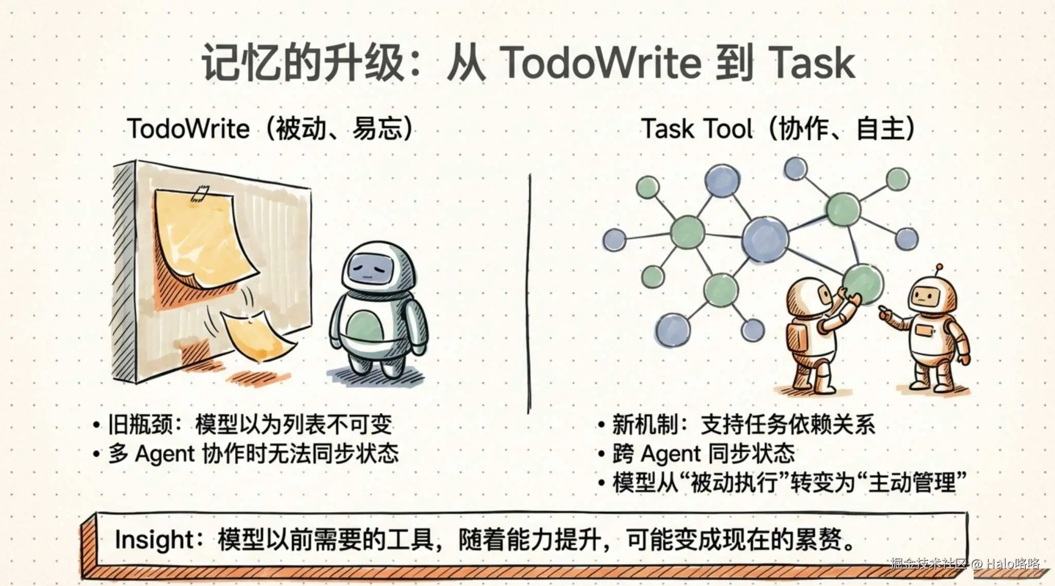 TodoWrite 到 Task Tool 的演化讲的是另一个教训:模型在进步,工具设计的假设需要跟着更新。
