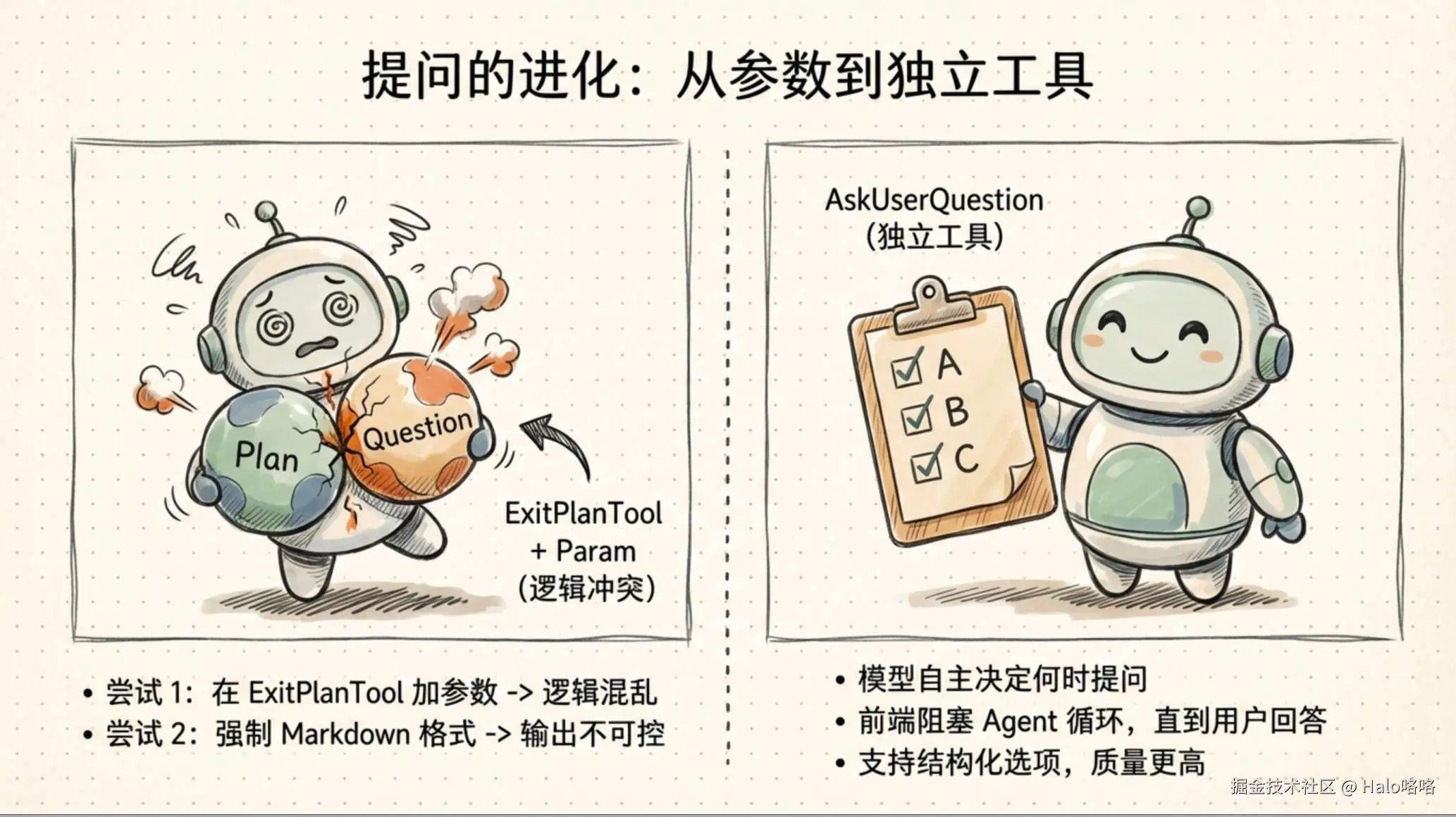 A["尝试 #1<br/>ExitPlanTool<br/>加参数"] -->|混淆模型| B["尝试 #2<br/>修改输出格式<br/>解析 Markdown"]