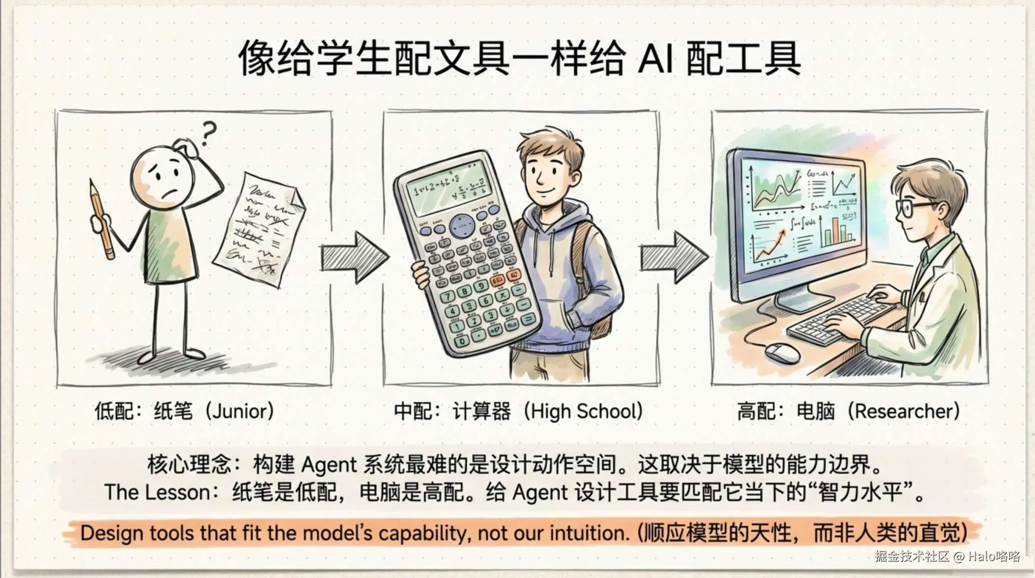 团队用了一个类比:面对一道数学难题,你想要纸、计算器还是电脑,取决于你自己的能力。给一个不会编程的人一台电脑,不如给他一个计算器。Agent 的工具设计也是同样的逻辑,你得先理解模型擅长什么、会怎么使用工具,然后根据这些观察来设计。