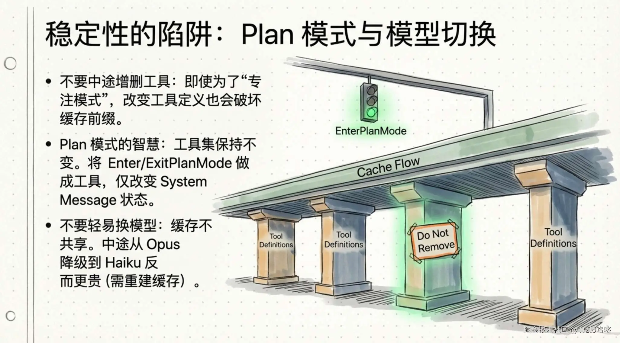 用户切换计划模式时,工具定义一个字都不变,模型只是收到一条消息说"你现在在计划模式,不要编辑文件,探索完了调用 ExitPlanMode"。缓存完美命中。附带的好处是,因为进入计划模式是一个工具调用而不是外部开关,模型在遇到复杂问题时可以自己决定先进计划模式想清楚再动手。