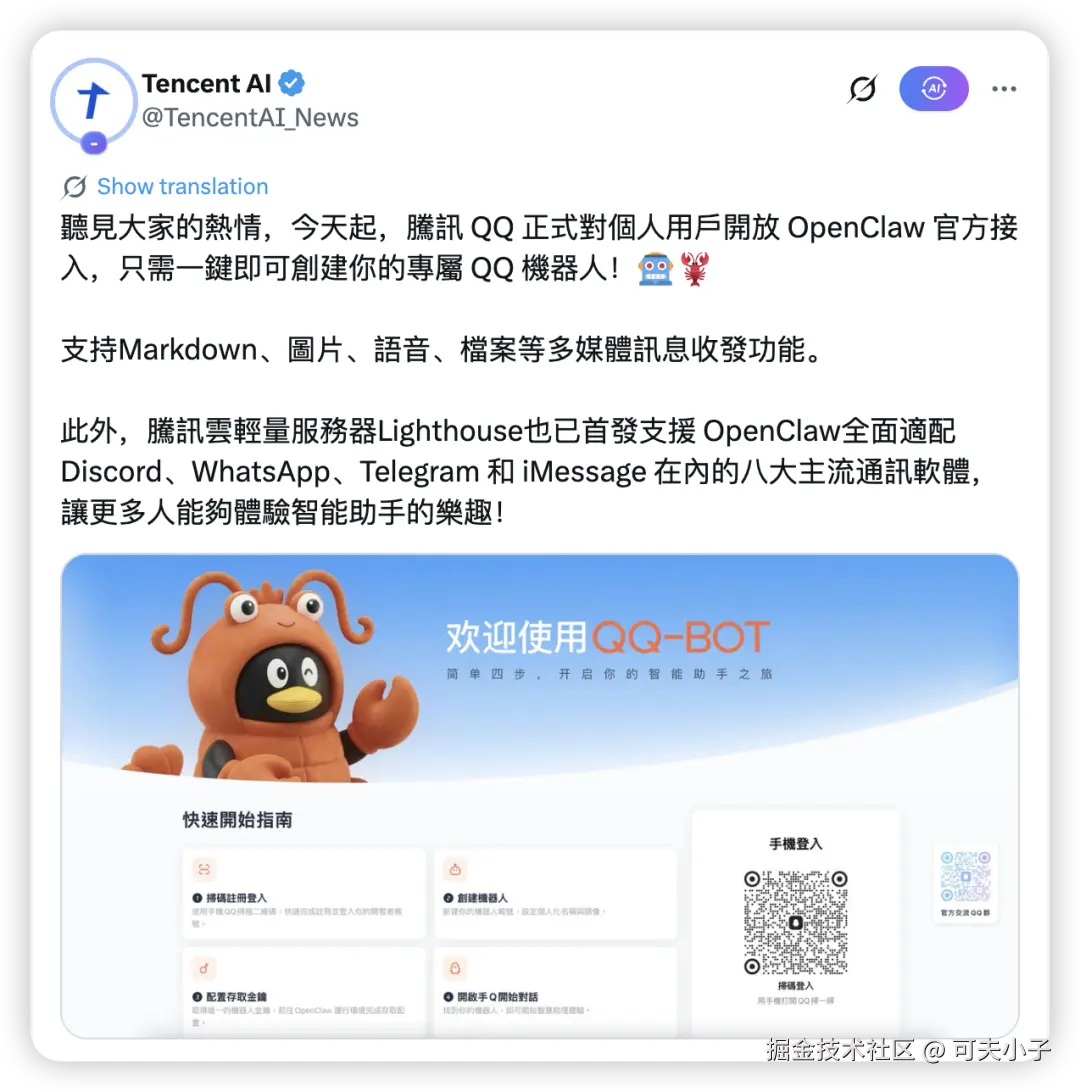 这不昨天QQ官方宣布支持接入OpenClaw,QQ毕竟是做聊天工具起家了,设置也很简单,值得一试。