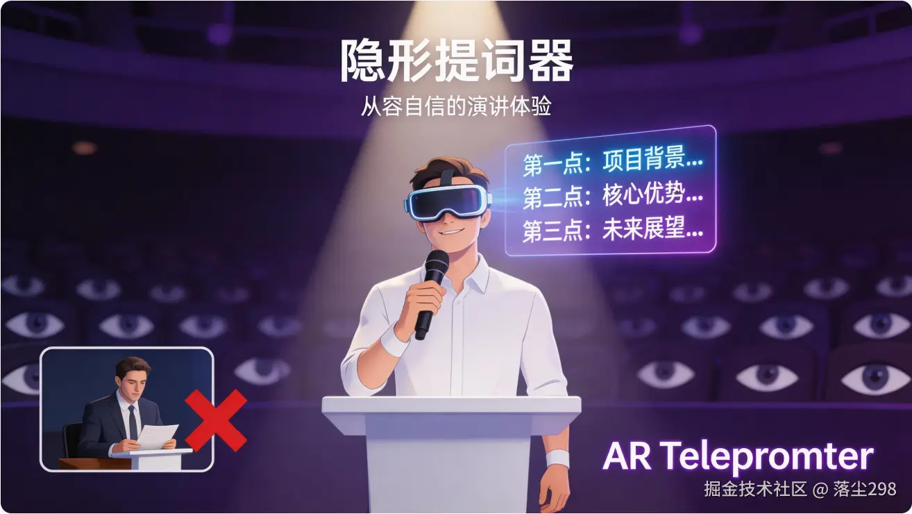 传统的解决方案是在讲台上放一张稿子,或者用 PPT 做备注。但低头看稿显得不专业,看 PPT 又要扭头,容易打断演讲节奏。如果能有一个只有自己能看到的"隐形提词器",演讲就能更加从容自信。