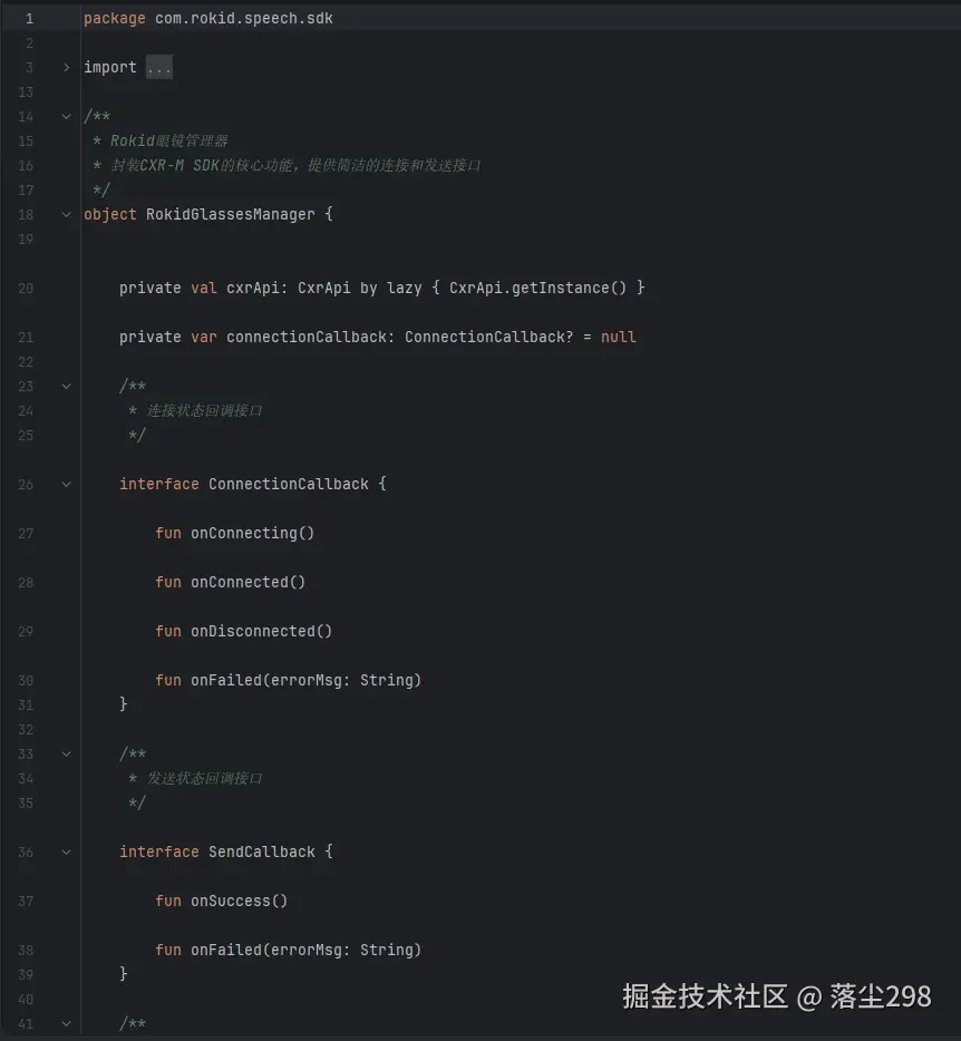 直接在业务代码中调用 SDK 会导致代码耦合度高、难以测试。我设计了一个 RokidGlassesManager 单例来封装所有眼镜交互逻辑。