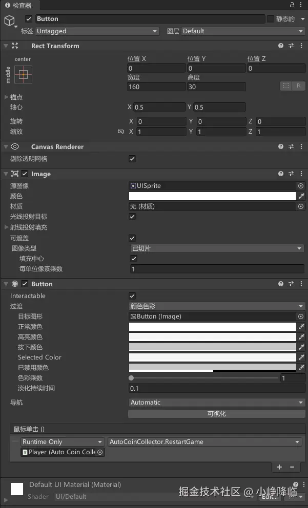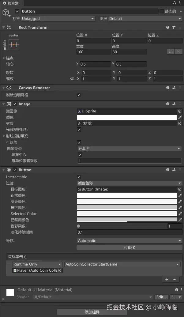 - 在 Inspector 中找到 Button 组件