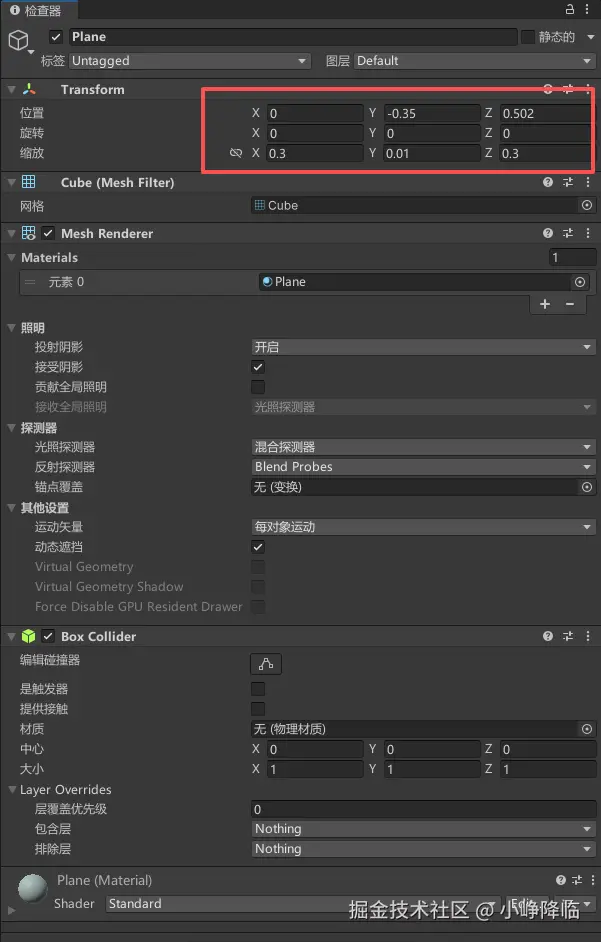 - 命名为 "Plane",位置配置如下(因为此处需要考虑手掌和实际大小,故设置为长宽30cm的平面,高1cm)