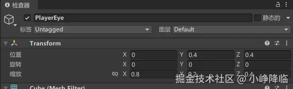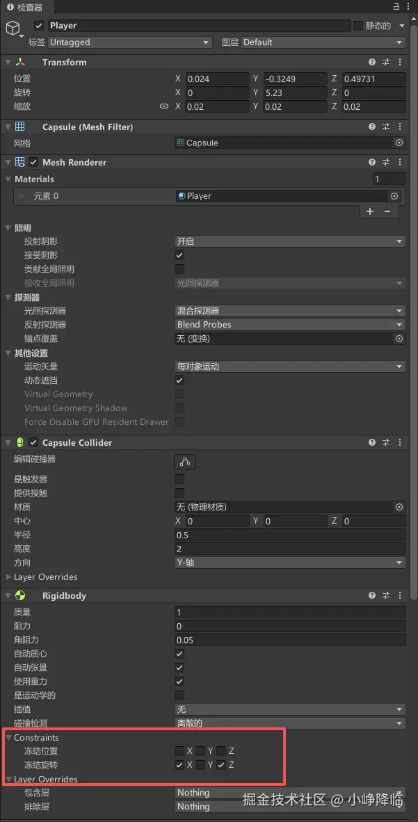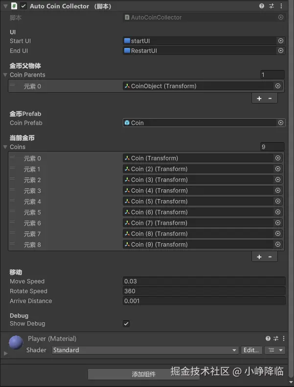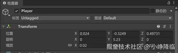 选中 Player 对象,将脚本直接拖入进去,在 Inspector 中配置: