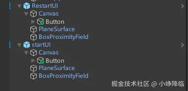 使用官方预制体,拖入两个,一个命名为开始,一个命名为重新开始,在Canvas下各自新建一个按钮,命名为开始和重新开始即可