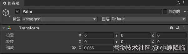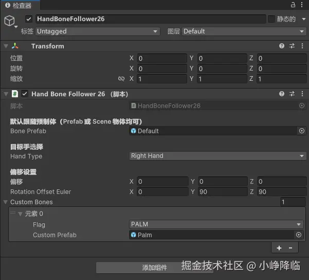 这里由于骨头模型默认是不带偏移和朝向的,因此为了贴合手掌,将脚本设置改为y轴和z轴旋转90度,这样可以不需要管预制体的旋转或偏移