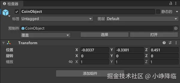 - 拖入场景中的CoinObject物体