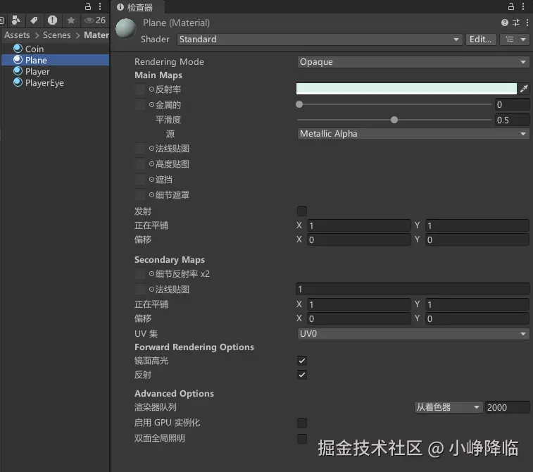 用到4个材质,分别为 Coin Plane Player PlayerEye