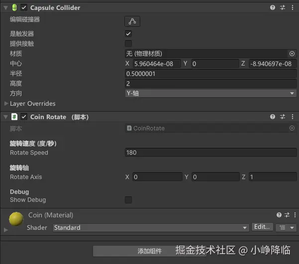 每个金币需要:进行配置,主要是勾选触发器,同时为了美观,增加一个自转脚本,创建个金色的材质Coin.mat,拖入即可