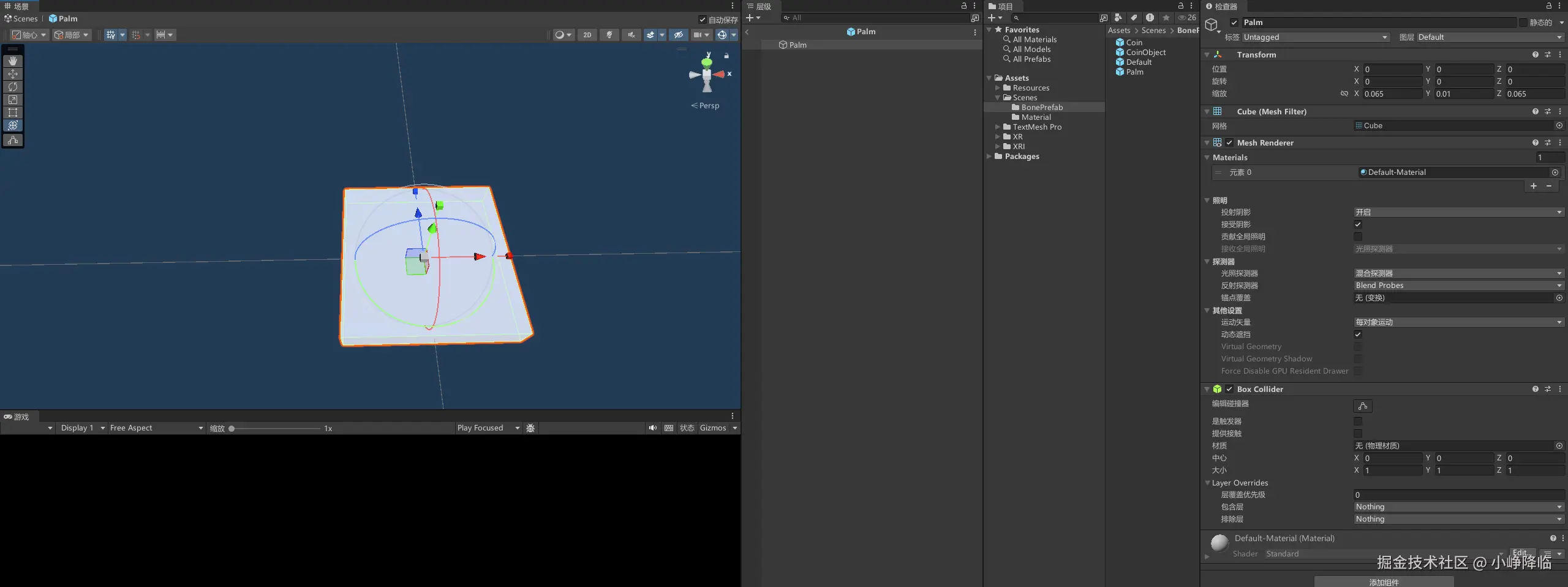 将金币调整大小和位置,适配整体大小,并制作成预制体,如下只需要注意旋转和缩放即可,位置在场景自由拜访