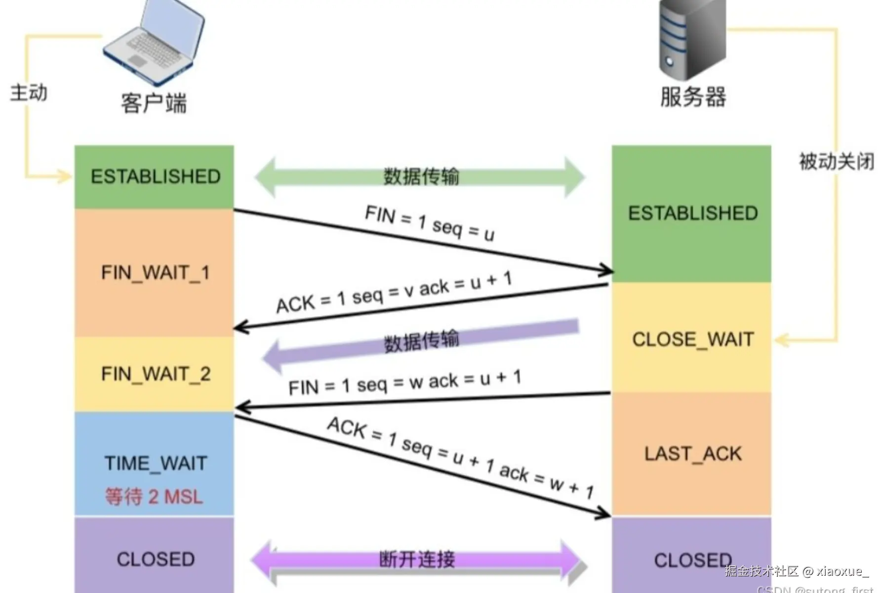 HTTP 版本 连接策略 触发四次挥手的场景 HTTP/1.0 默认短连接 每传输完 1 个资源(如 HTML、单张图片)后,立即触发四次挥手 HTTP/1.1 默认长连接( Connection: keep-alive)① 页面所有核心资源传输完成后,连接空闲超过超时时间(浏览器默认约 60s);② 页面关闭 / 刷新 / 标签页销毁时;③ 服务器主动关闭(如单连接最大请求数超限) HTTP/2/3 多路复用长连接 仅在页面关闭、标签页销毁、浏览器关闭或连接长时间空闲时触发 (2)四次挥手的完整详细过程(客户端主动发起关闭为例)