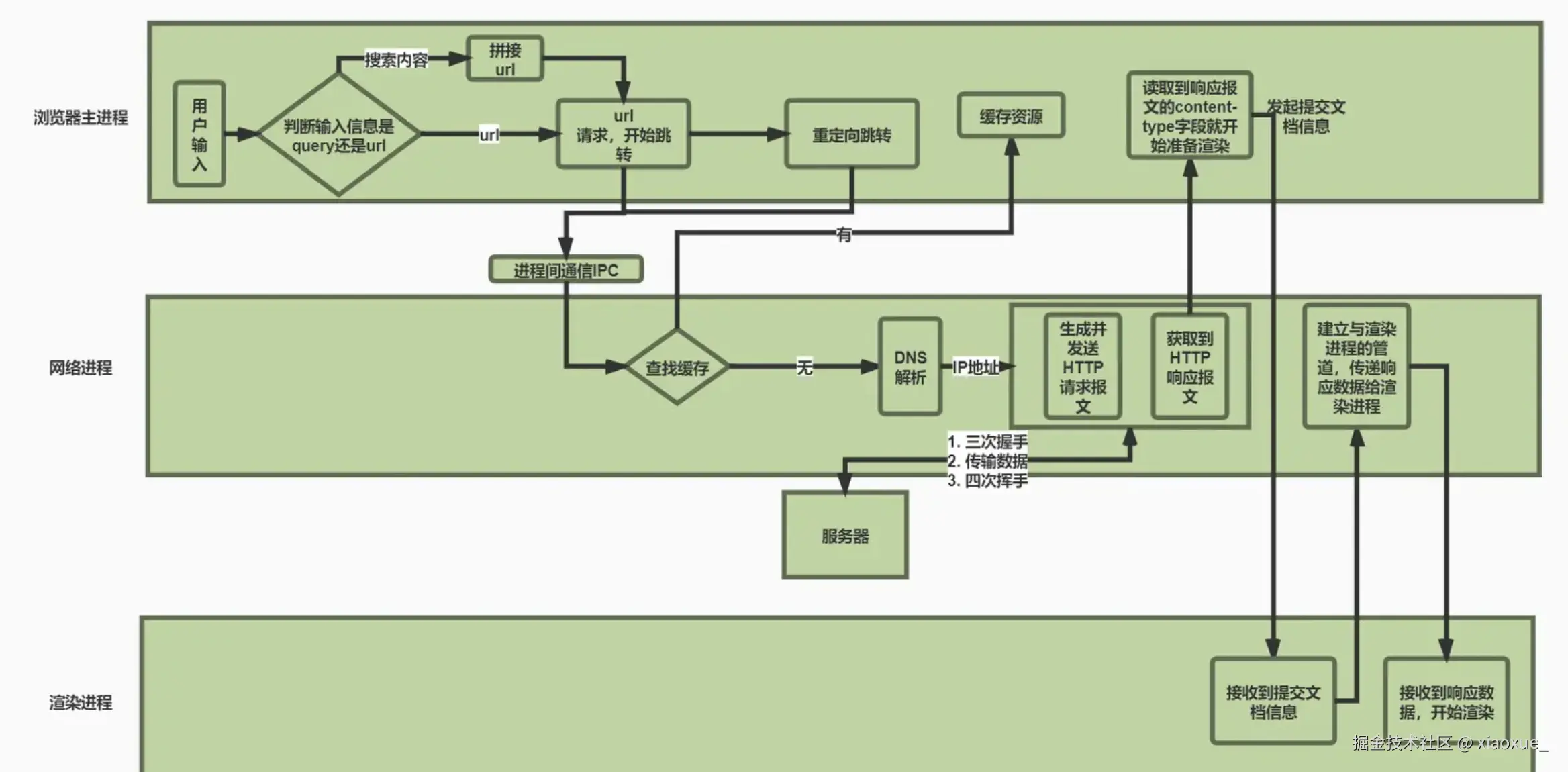 回答该问题时,需按 "进程协作→URL 预处理→DNS 解析→TCP 握手→HTTP 交互→导航提交→协议支撑→性能优化" 的逻辑组织,核心是体现 "多进程协同" 和 "网络协议栈" 两大主线,而非零散罗列知识点。
