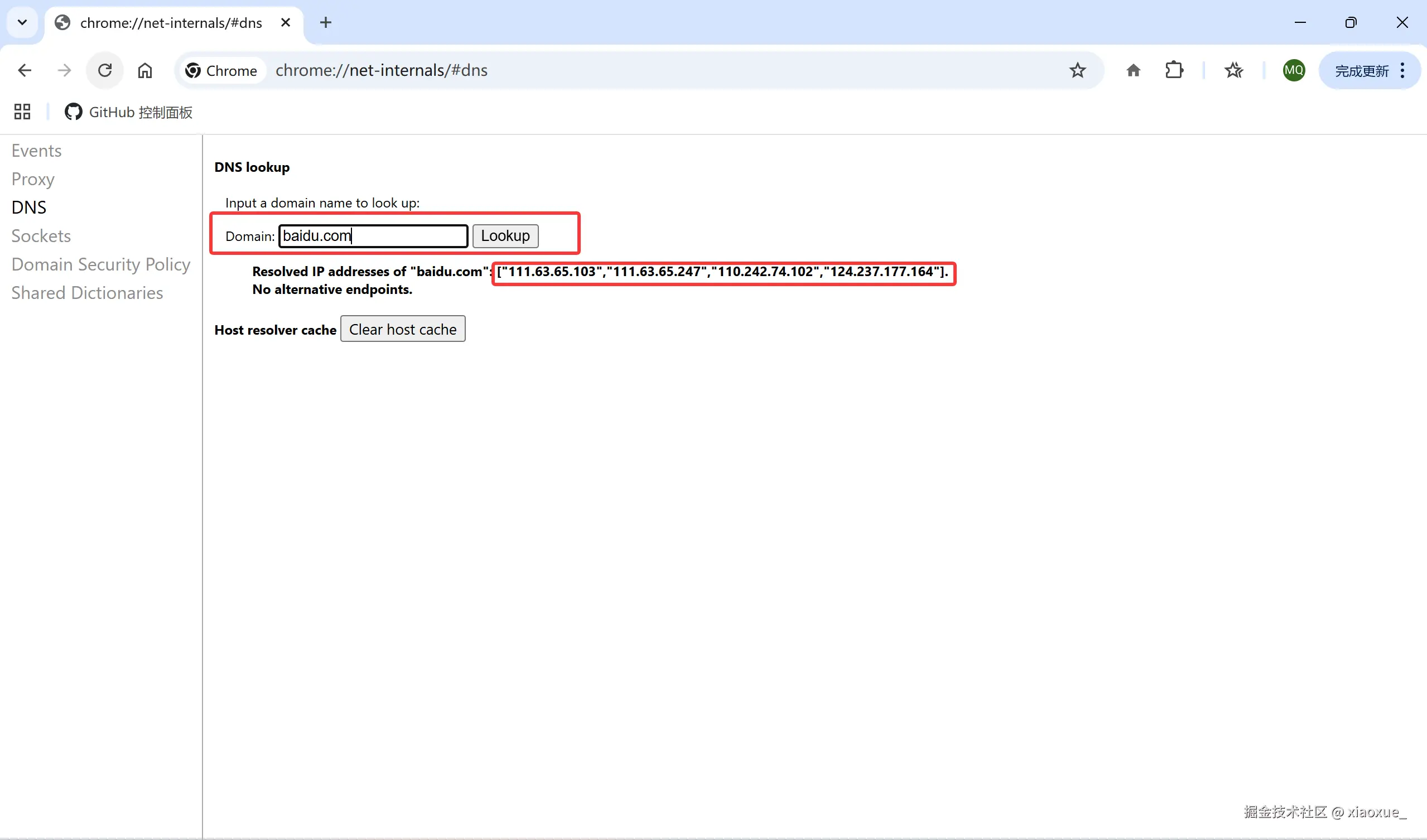 chrome://net-internals/#dns查看 DNS 缓存中记录的 IP 地址列表。若缓存中存在对应域名的有效记录,浏览器在解析该域名时,会优先使用缓存中的 IP 地址,而无需发起新的 DNS 查询。