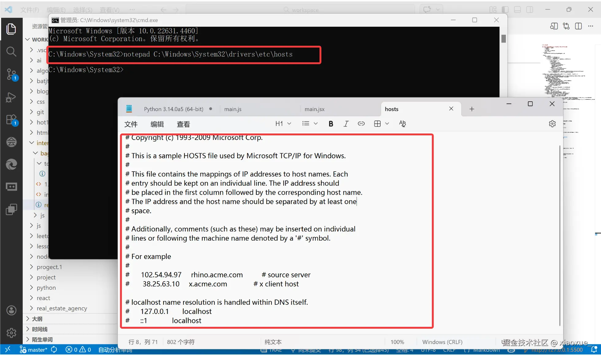 127.0.0.1 → douyin.com,模拟带域名访问本地代码)。hosts文件的本质是一个本地的 "域名→IP" 映射表 ,它的优先级比 DNS 服务器更高。当你在浏览器中输入一个域名时,系统会先检查hosts文件中是否有对应的 IP 映射。如果有,就直接使用这个 IP,而不会去请求 DNS 服务器。