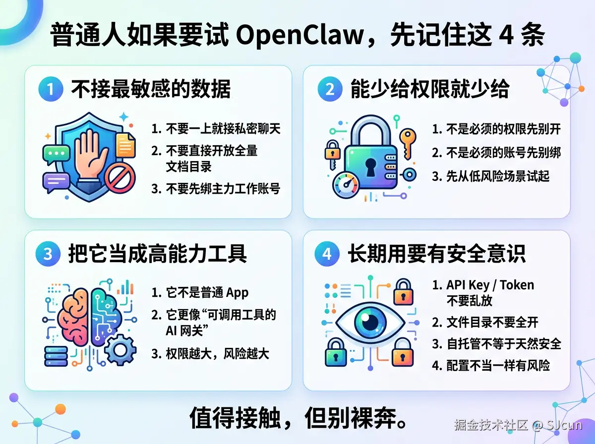我并不觉得因为有风险,就完全不要接触 OpenClaw。 但我会明确建议: